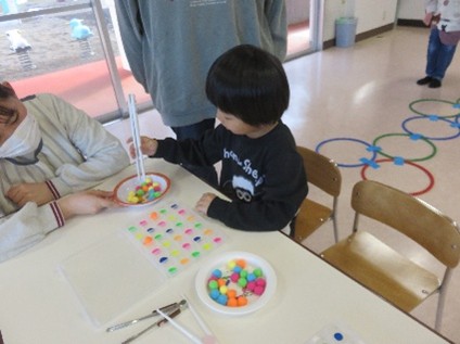 前半は集団課題の洗濯バサミや引き起こし・トングなどを行いました。